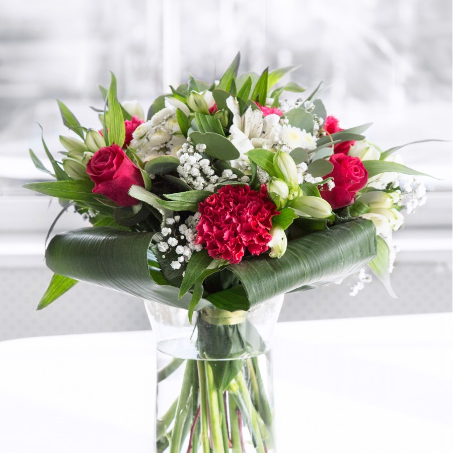 Experience the pure elegance of our white blossom bouquet, designed to inspire and delight. This exquisite arrangement includes mini white chrysanthemums, graceful gypsophila, radiant red roses, playful carnations, immaculate white alstroemeria, and abundant aspidistra leaves.