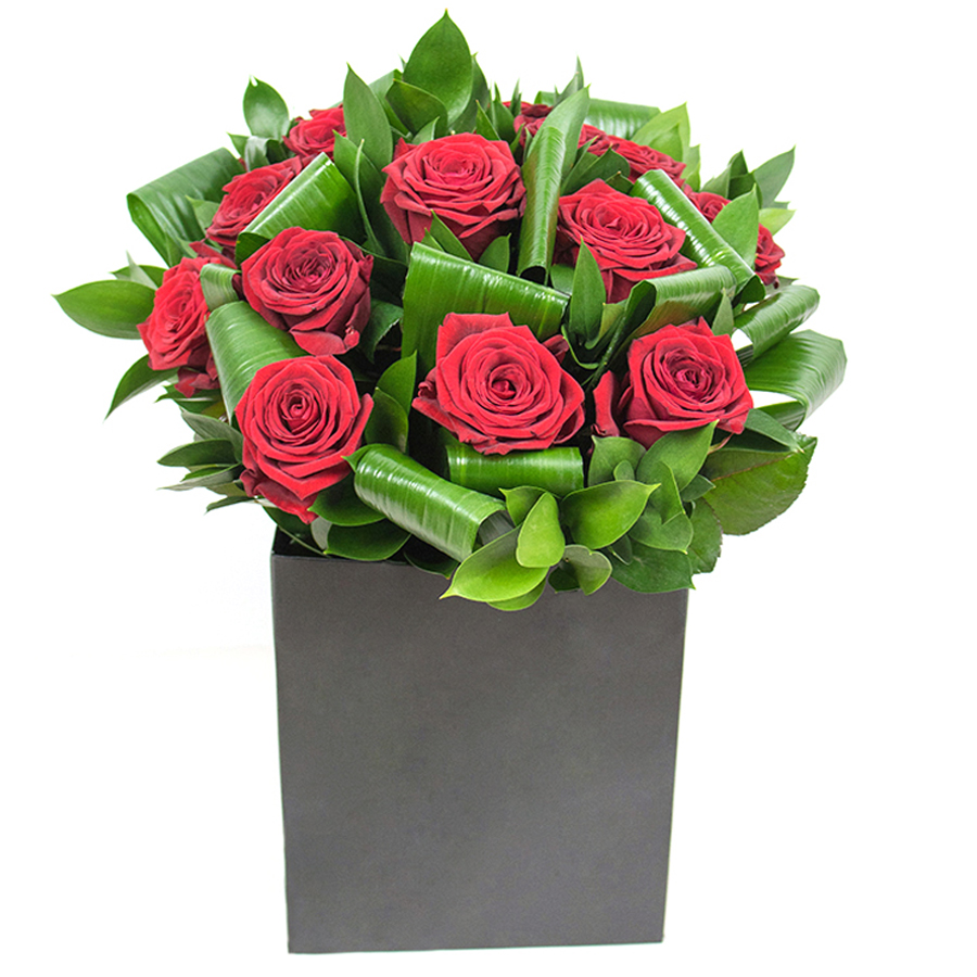 Our refined red rose bouquet combines the lushness of aspidistra leaves with the elegance of ruscus, creating a unique and stylish floral arrangement. Perfect for adding sophistication to any environment.